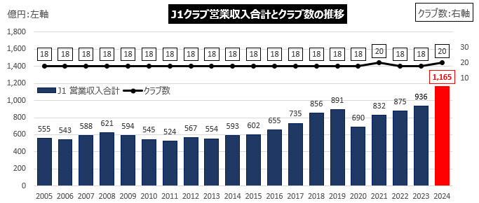 参考:J1リーグに所属する各Jクラブが計上した営業収入合計の推移