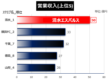 1位は、清水エスパルスで営業収入が50億円(順位は優勝)になった。J2に所属するJクラブにおける過去最高額の営業収入であった2023年度の51億円(順位は4位)よりは減少しているものの、多額の営業収入となった。