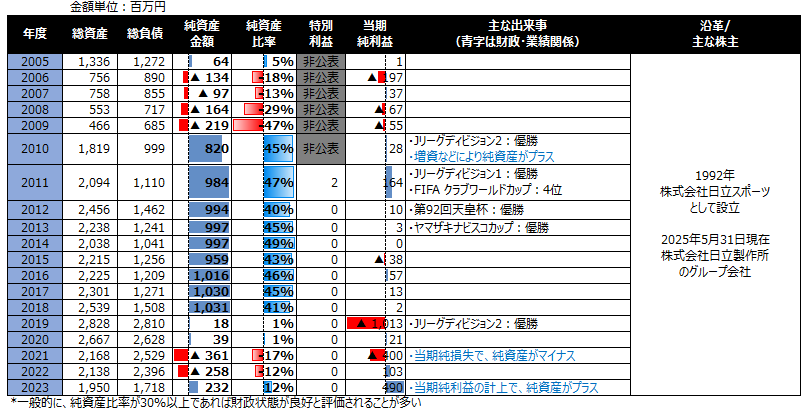 柏レイソルは、2005年度に純資産64百万円、純資産比率5%であった。その後、当期純利益のマイナスなどで2022年度末には純資産▲258百万円のマイナス、純資産比率▲12%のマイナスになった。2023年度は当期純利益490百万円を計上し、純資産232百万円、純資産比率12%に回復している。