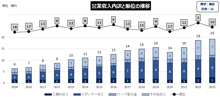 参考:サンフレッチェ広島の営業収入内訳と順位(J1/J2)の推移