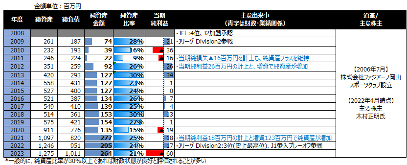 ファジアーノ岡山は、2009年度に純資産74百万円、純資産比率28%であった。その後、当期純利益と増資で純資産が増加し、2023年度末は、純資産264百万円、純資産比率21%となっている。