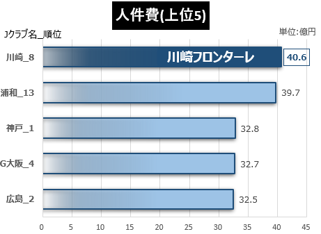 なお、2023年度の上位5クラブ(カッコ内は人件費)は、浦和レッズ(38.6億円)、ヴィッセル神戸(38.0億円)、川崎フロンターレ(33億円)、横浜Fマリノス(30億円)、名古屋グランパス(28億円)であった。
