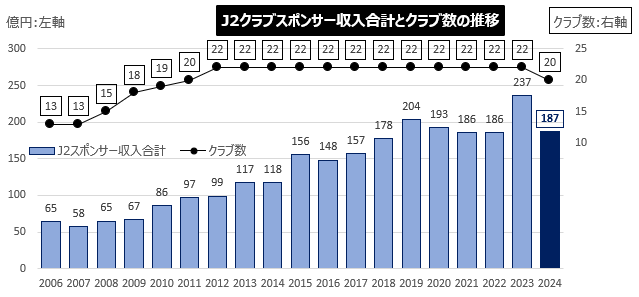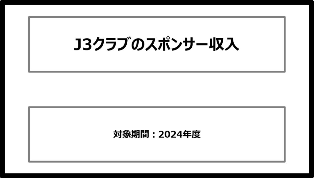 2024年度は、2023年度の69億円より28億円増加した97億円(J3のクラブ数20)となった。主な要因は、スポンサー収入が比較的高額な大宮アルディージャ(15億円)とツエーゲン金沢(6億円)がJ3リーグに降格したこと、SC相模原のスポンサー収入が2億円から9億円と7億円増加した影響である。