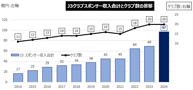 J3リーグが創設された2014年度は17億円(J3のクラブ数11)であったが、クラブ数の増加などで徐々に増加し、2023年度には69億円(J3のクラブ数20)と初年度の4倍以上のスポンサー収入となった。