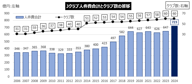 はじめに、2006年以降、Jリーグに所属する各Jクラブが計上した人件費合計の推移をみる。