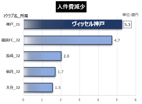 1位は、ヴィッセル神戸で、2023年度の38.0億円から2024年度は32.7億円と5.3億円減少した。ヴィッセル神戸は、2019年度に人件費が69億円とJクラブの中で最も高額であったが、徐々に減少している。