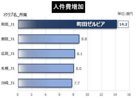1位は、町田ゼルビアで、2023年度の18.1億円から2024年度は32.3億円と14.2億円増加した。町田ゼルビアは、2018年度にサイバーエージェントが株主になり、J1リーグに昇格した2024年度は人件費が79%増加している。