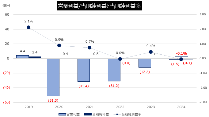 2024年度は、営業利益が1.5億円とマイナスであるものの特別利益を2億円計上し、当期純利益は△0.1億円、当期純利益率は△0.1%になった。