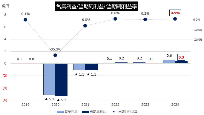 2024年度は、当期純利益が2023年度の0.1億円より0.2億円増加した0.3億円となり、当期純利益率が0.9%となった。