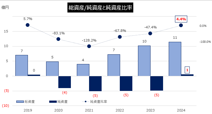 2024年度は、ゼビオホールディングス株式会社を引受先とする5億円の第3者割当増資を行い純資産が1億円となり、純資産比率は4.4%になった。